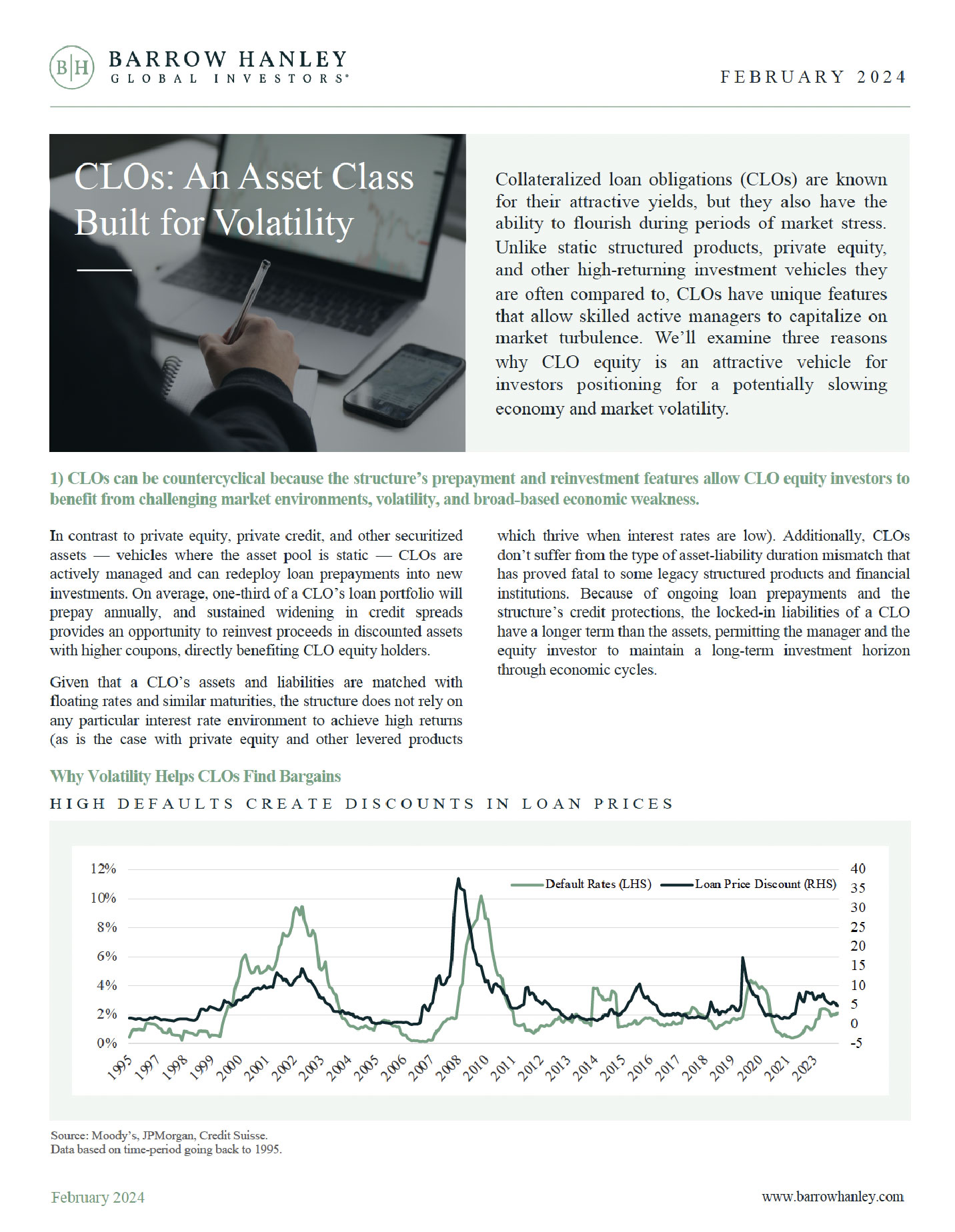 Collateralized loan obligations (CLOs) are known for their attractive yields, but they also have the ability to flourish during periods of market stress. Unlike static structured products, private equity, and other high-returning investment vehicles they are often compared to, CLOs have unique features that allow skilled active managers to capitalize on market turbulence. We’ll examine three reasons why CLO equity is an attractive vehicle for investors positioning for a potentially slowing economy and market volatility.