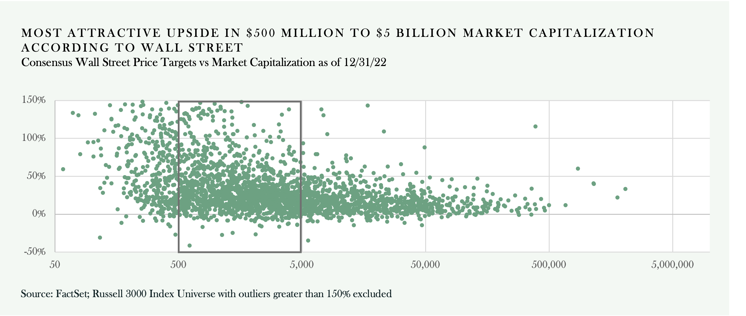 Drilling down into the underlying companies, the opportunity set for small caps remains far more attractive than that of larger companies. Looking at the Russell 3000 Index, a broad composition of stocks including both small caps and large caps, companies under $5 billion in market capitalization have far greater expected upside based on market consensus price targets. (Figure 2)